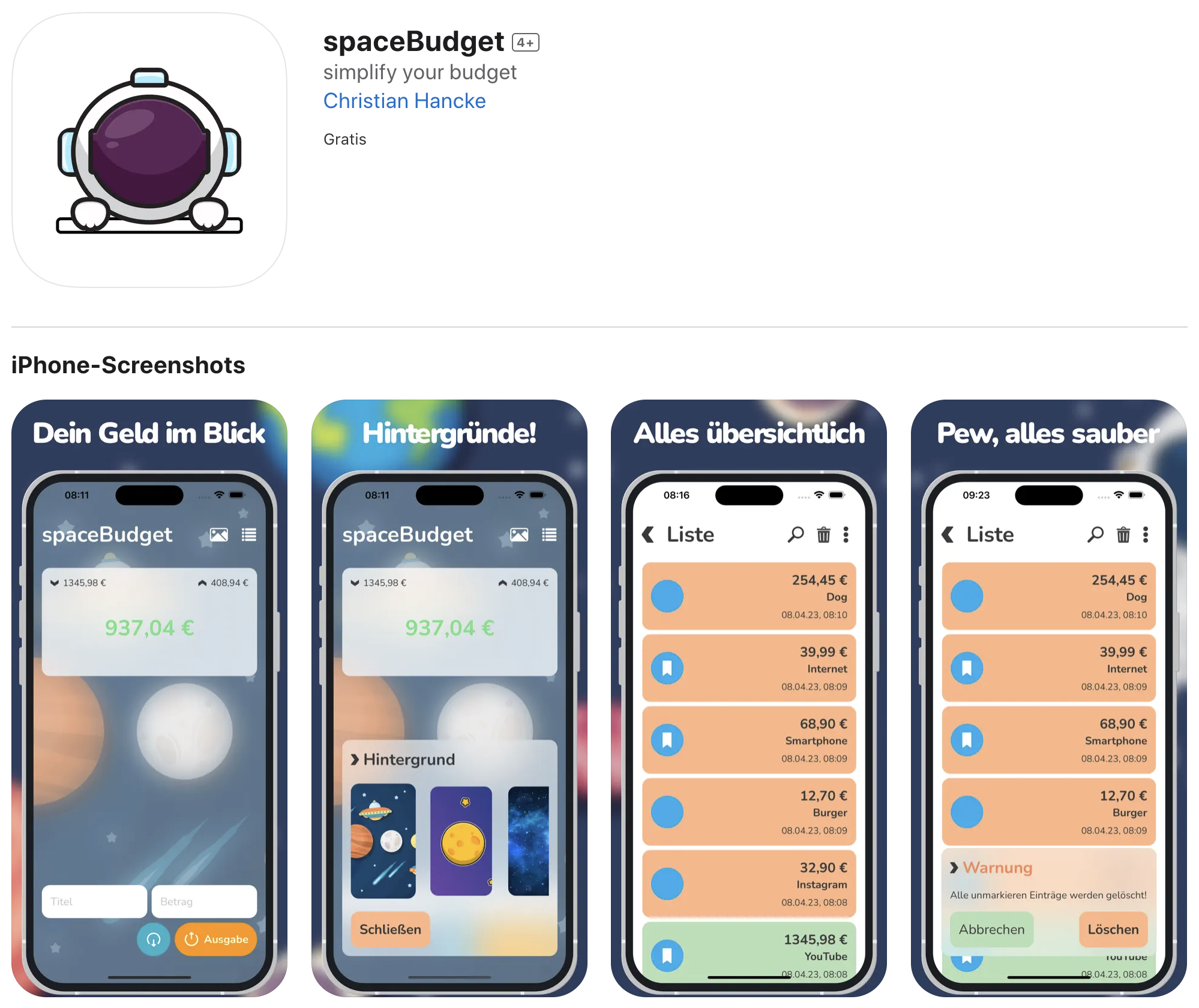 spaceBudget bietet dir die einfachste Möglichkeit deine Einnahmen und Ausgaben in wenigen Sekunden zu erfassen. Du verstaust dein Portemonnaie, und noch an der Kasse des Supermarkts speicherst du deine Ausgabe in spaceBudget, so hast du sofort den Überblick über dein verbleibendes Geld.